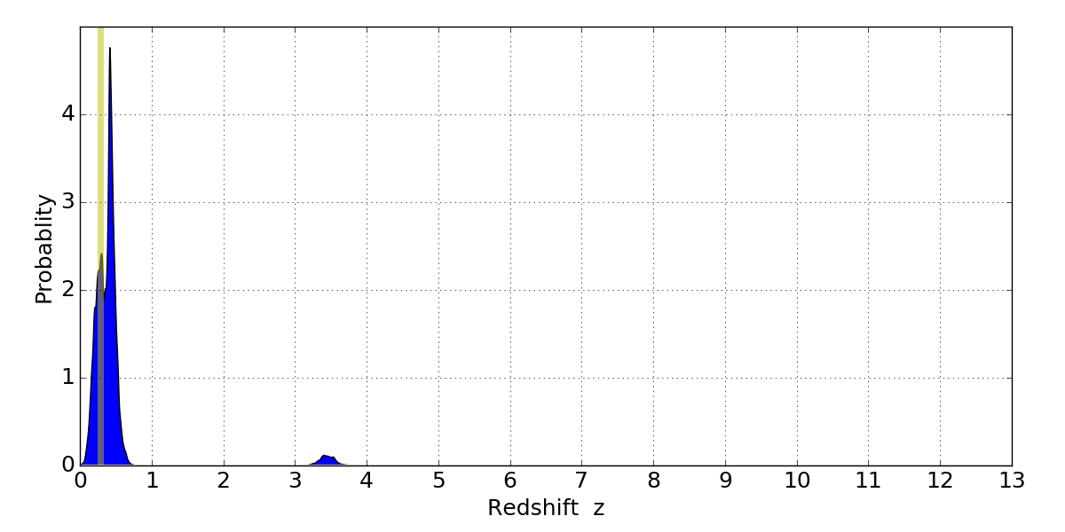In P(z) plots: Yellow lines mark the cluster redshift z = 0.284,