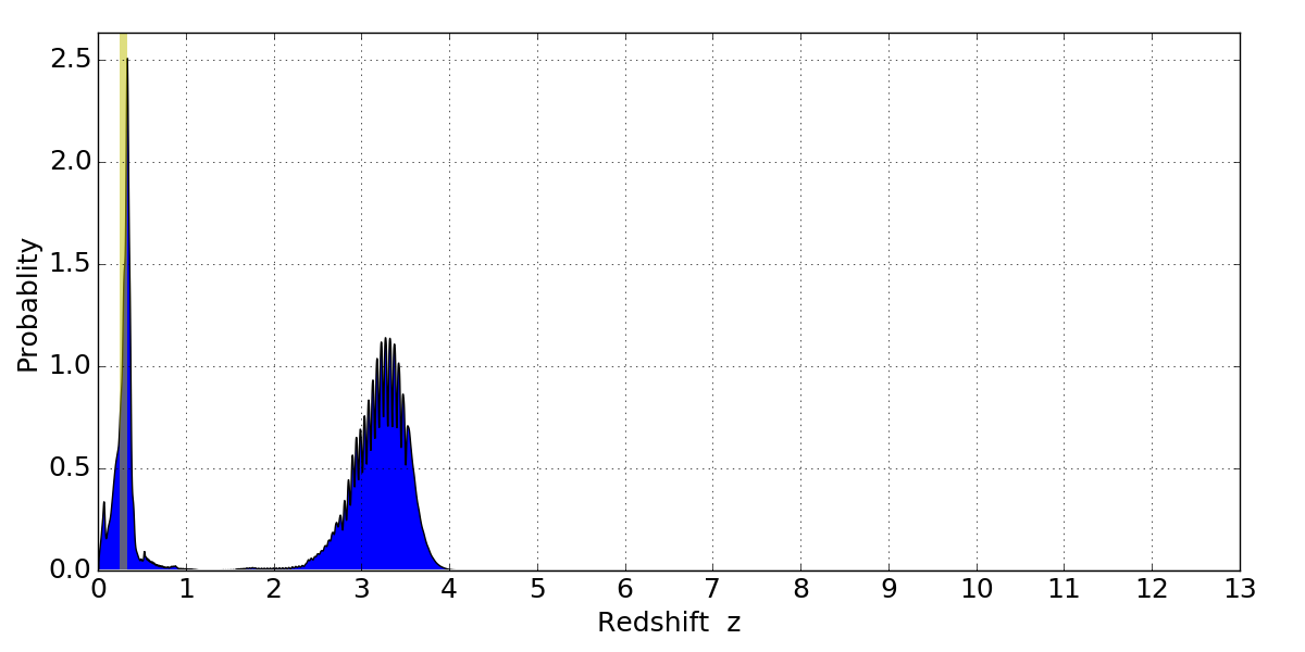 In P(z) plots: Yellow lines mark the cluster redshift z = 0.284,