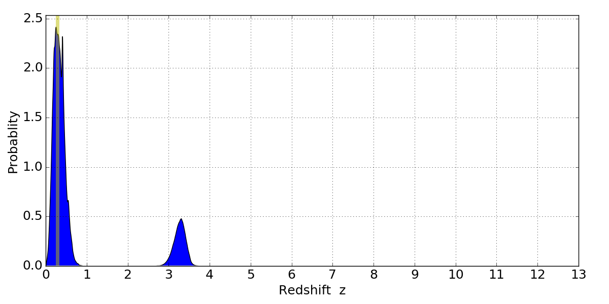 In P(z) plots: Yellow lines mark the cluster redshift z = 0.284,