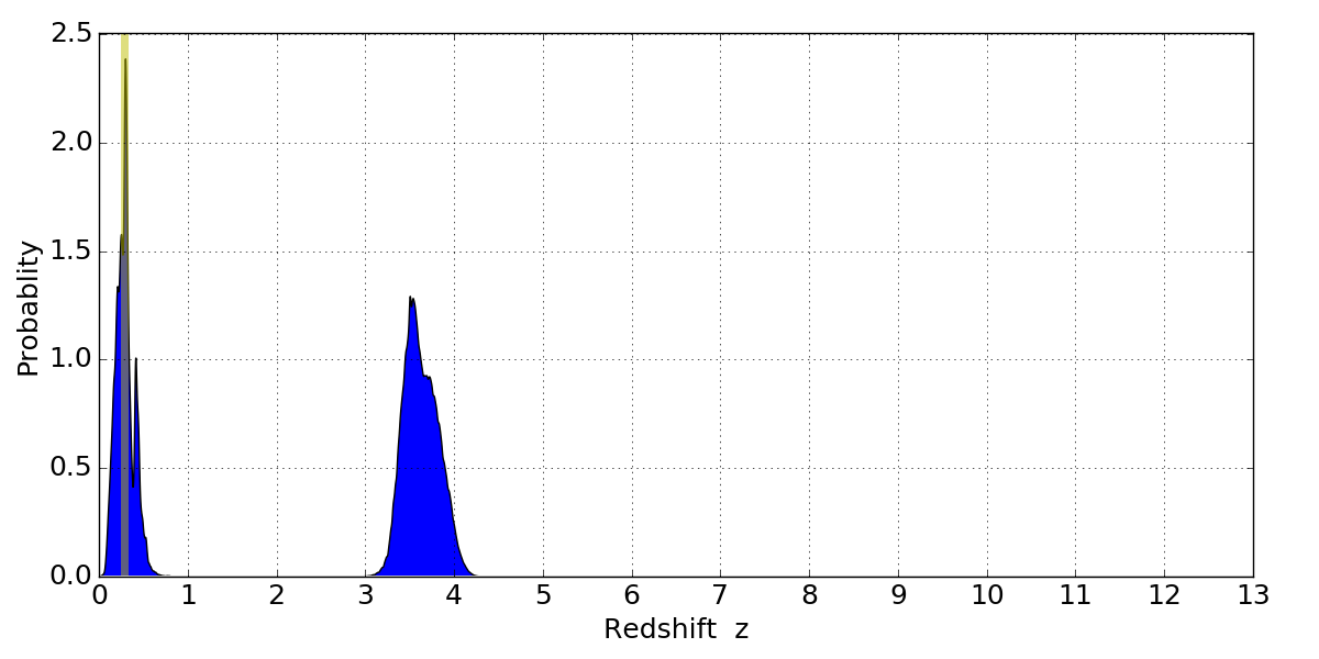In P(z) plots: Yellow lines mark the cluster redshift z = 0.284,