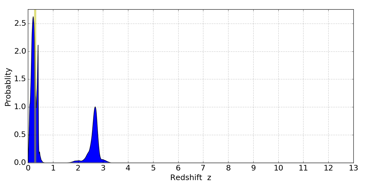 In P(z) plots: Yellow lines mark the cluster redshift z = 0.284,