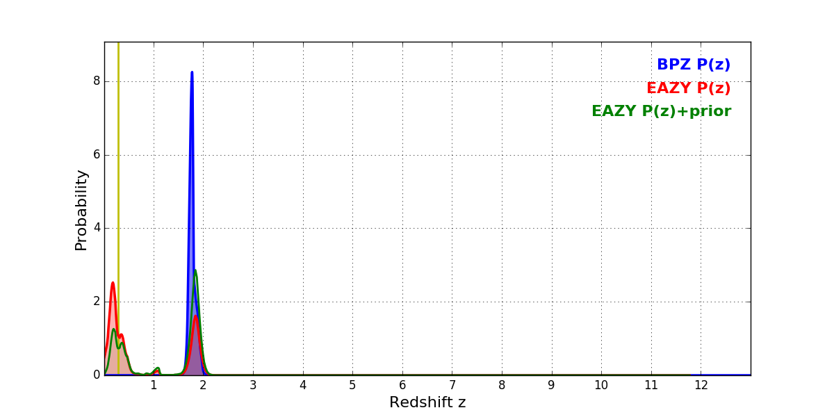 In P(z) plots: Yellow lines mark the cluster redshift z = 0.284,