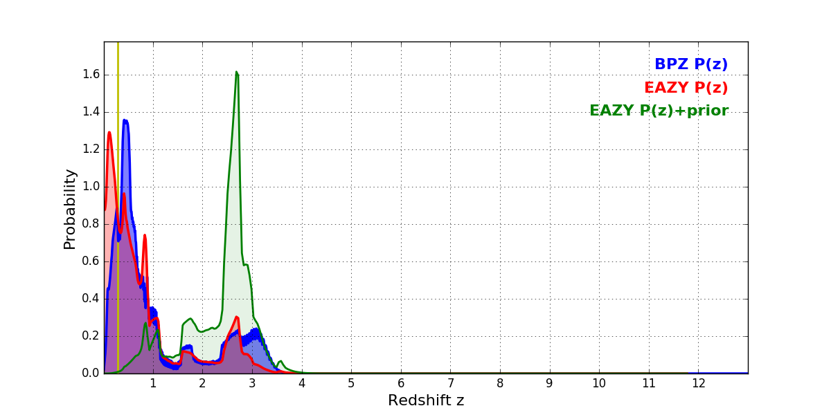In P(z) plots: Yellow lines mark the cluster redshift z = 0.284,