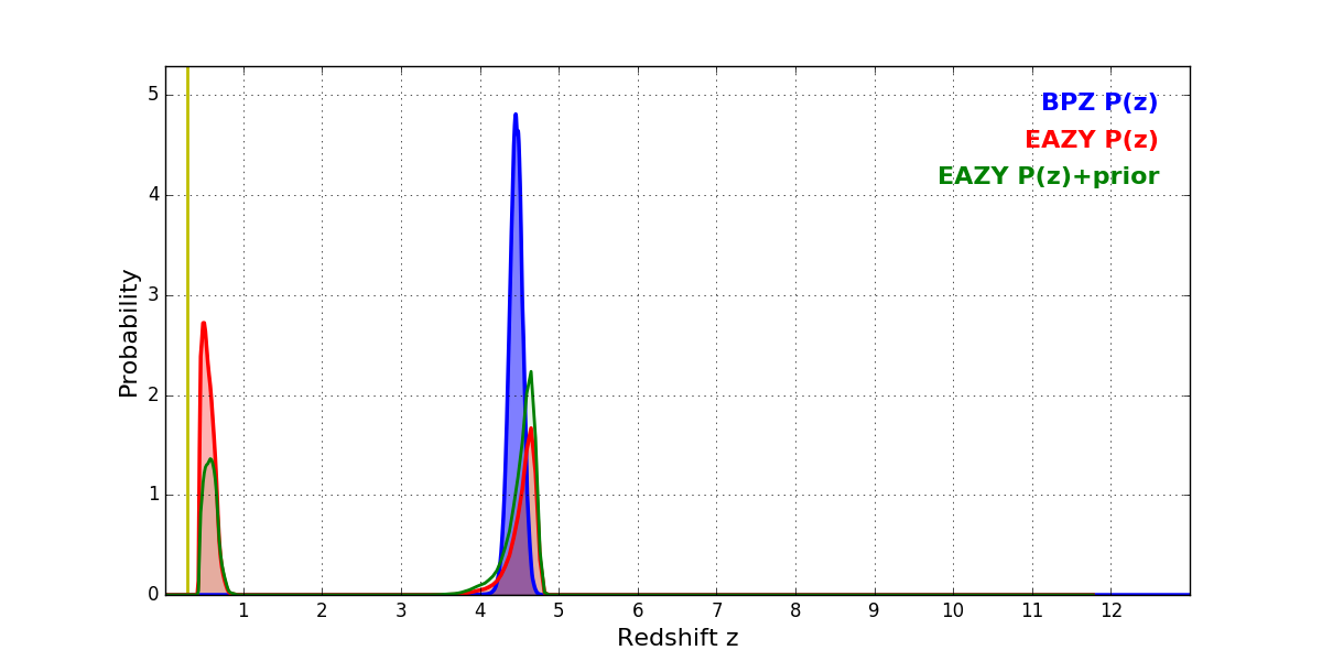 In P(z) plots: Yellow lines mark the cluster redshift z = 0.284,