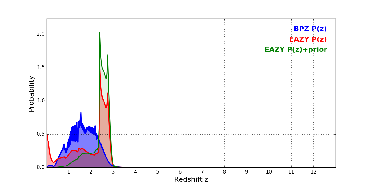 In P(z) plots: Yellow lines mark the cluster redshift z = 0.284,