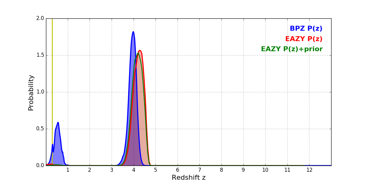 In P(z) plots: Yellow lines mark the cluster redshift z = 0.284,