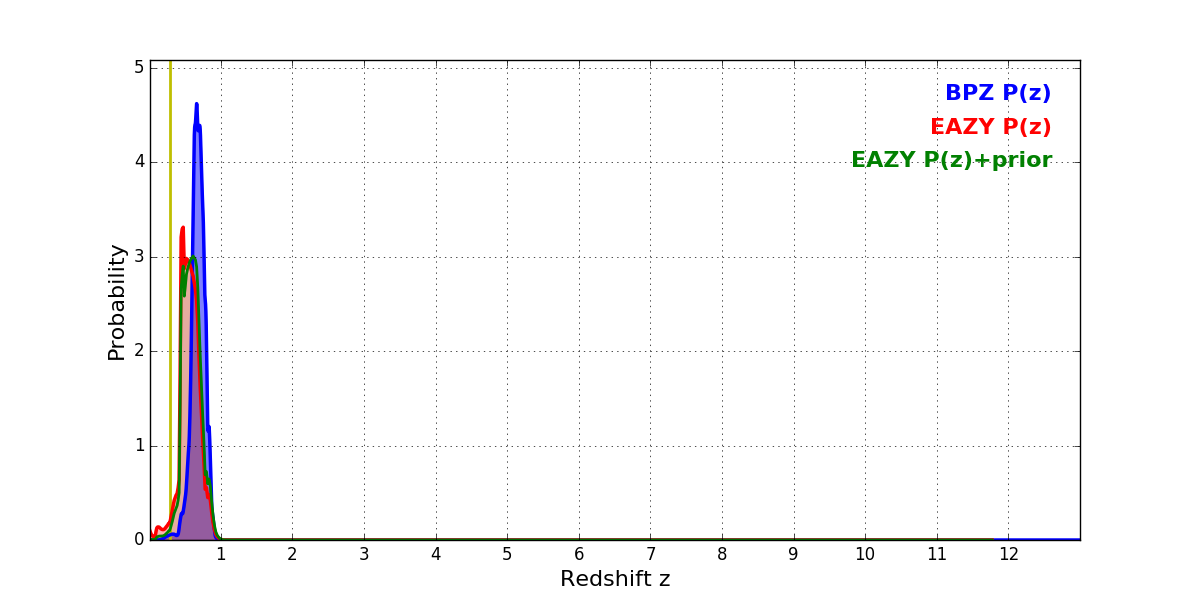 In P(z) plots: Yellow lines mark the cluster redshift z = 0.284,