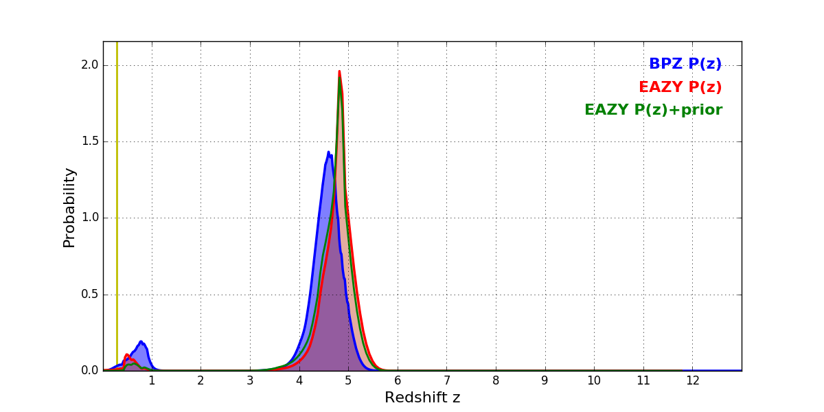 In P(z) plots: Yellow lines mark the cluster redshift z = 0.284,