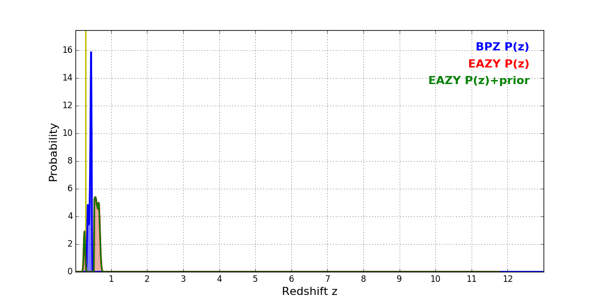 In P(z) plots: Yellow lines mark the cluster redshift z = 0.284,