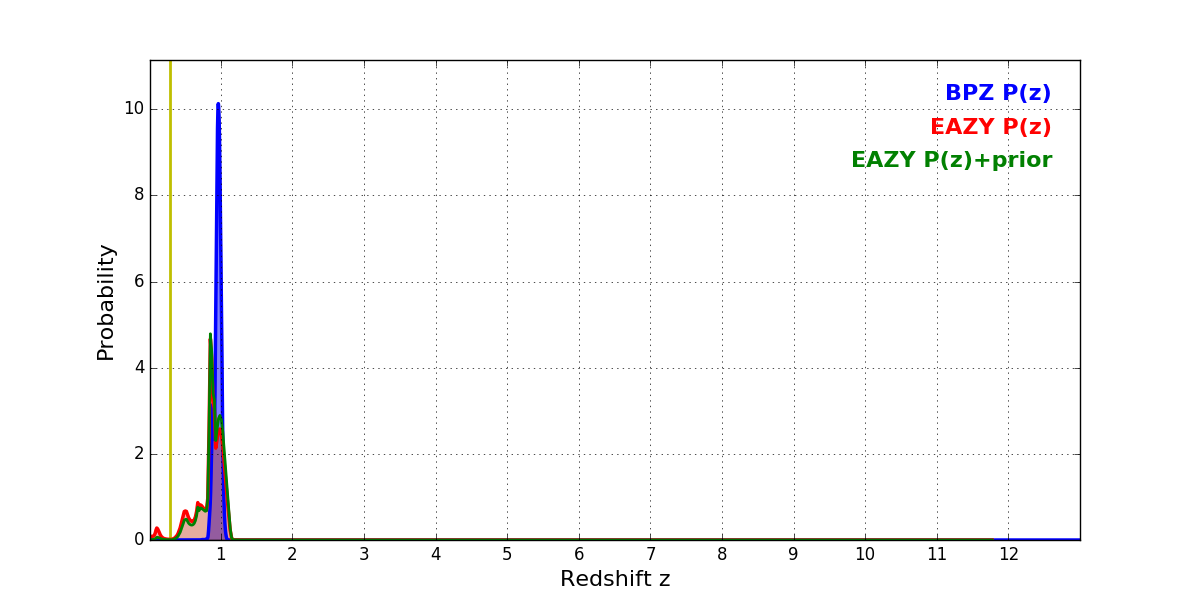 In P(z) plots: Yellow lines mark the cluster redshift z = 0.284,
