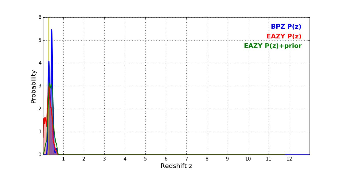 In P(z) plots: Yellow lines mark the cluster redshift z = 0.284,