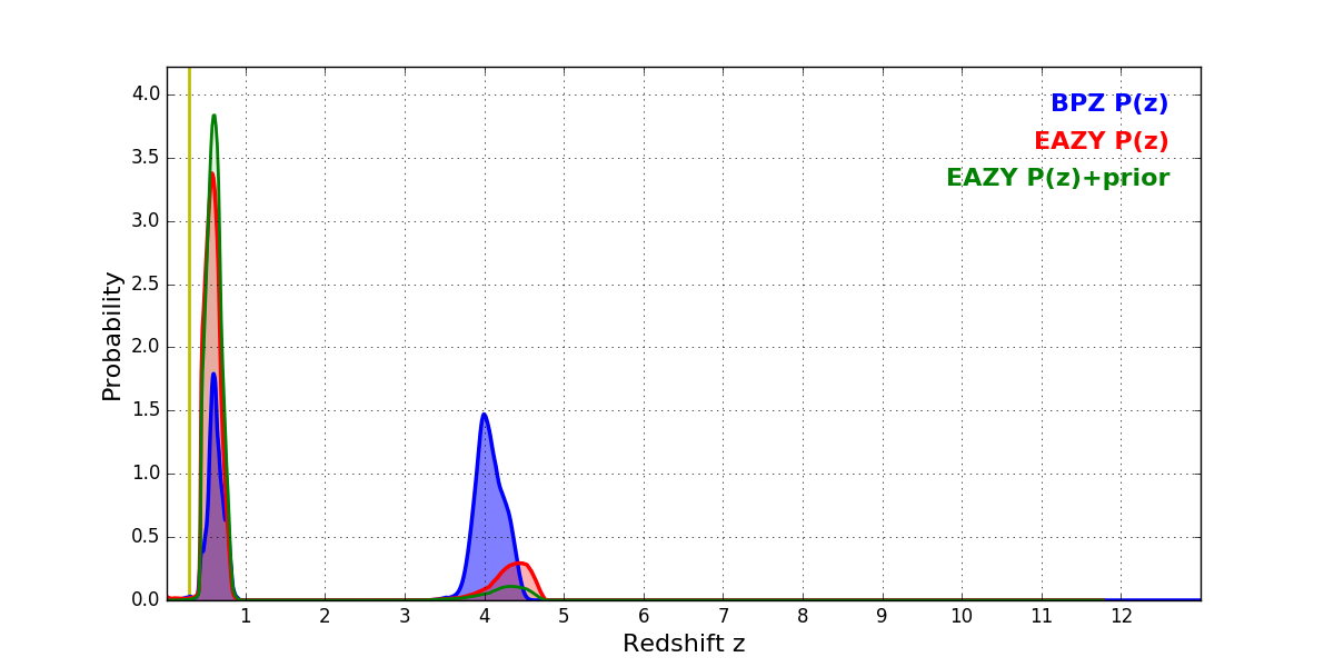 In P(z) plots: Yellow lines mark the cluster redshift z = 0.284,