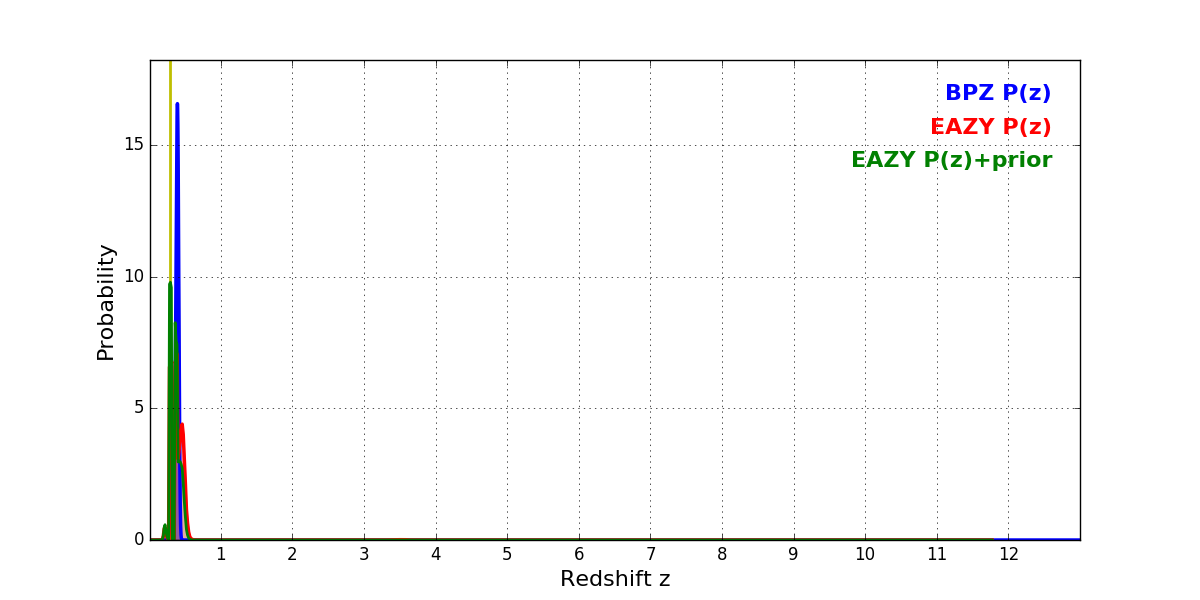In P(z) plots: Yellow lines mark the cluster redshift z = 0.284,