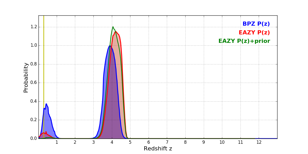 In P(z) plots: Yellow lines mark the cluster redshift z = 0.284,
