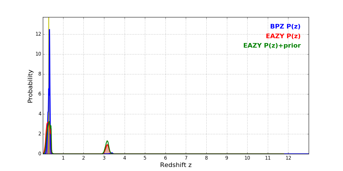 In P(z) plots: Yellow lines mark the cluster redshift z = 0.284,