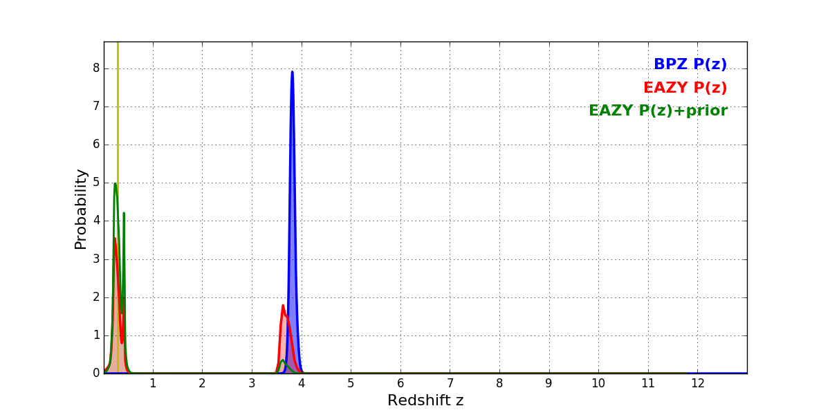 In P(z) plots: Yellow lines mark the cluster redshift z = 0.284,