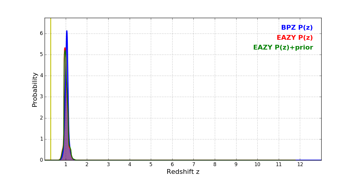 In P(z) plots: Yellow lines mark the cluster redshift z = 0.284,