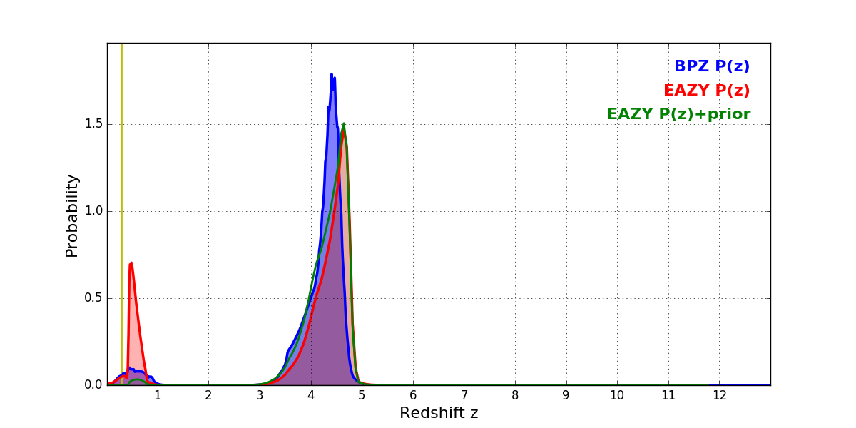 In P(z) plots: Yellow lines mark the cluster redshift z = 0.284,