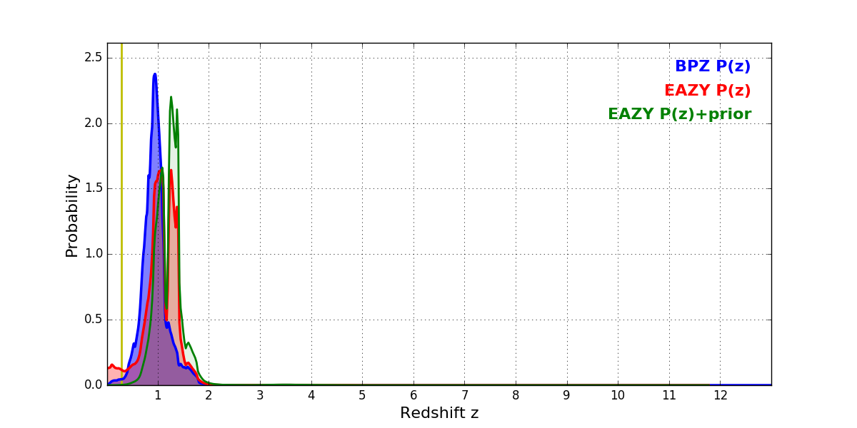 In P(z) plots: Yellow lines mark the cluster redshift z = 0.284,