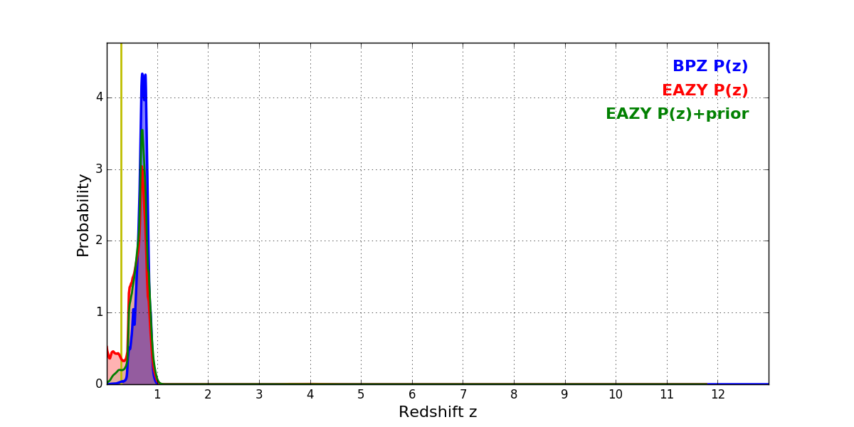 In P(z) plots: Yellow lines mark the cluster redshift z = 0.284,