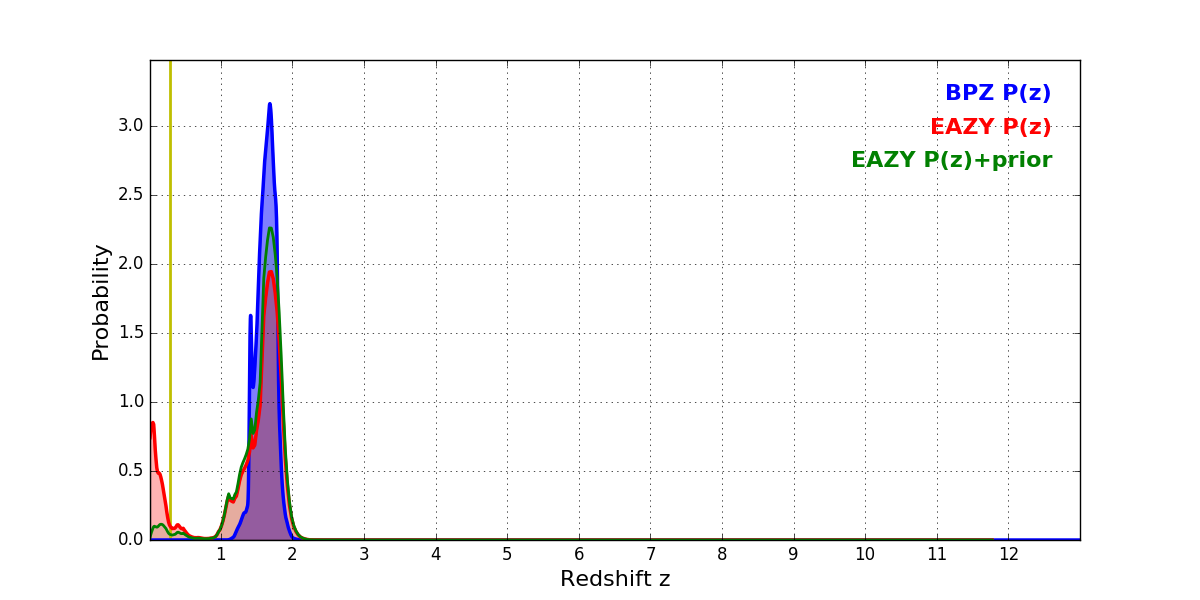 In P(z) plots: Yellow lines mark the cluster redshift z = 0.284,