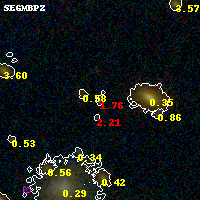 Object #1012   x,y = (2026, 3809)   RA, Dec = (06:00:12.648, -20:07:03.72) = (90.05270, -20.11770)   BPZ = 1.757 [0.883--2.658]   type = 10.50 (SB11_A_0_l - SB3_B10)   stellarity = 0.20   chisq2 = 1.49   ODDS = 0.23   z_cluster = 0.460