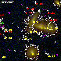 Black segments are analyzed here. Roll mouse over color images to view segments. Best viewed in a wide browser window (1200 pixels or more). Download SED & P(z) plots to view larger versions.