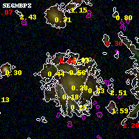 Black segments are analyzed here. Roll mouse over color images to view segments. Best viewed in a wide browser window (1200 pixels or more). Download SED & P(z) plots to view larger versions.