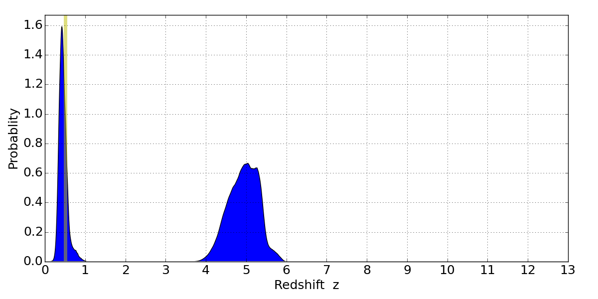 In P(z) plots: Yellow lines mark the cluster redshift z = 0.505,