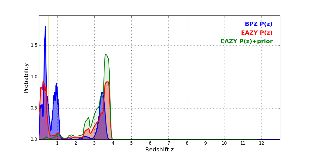 In P(z) plots: Yellow lines mark the cluster redshift z = 0.505,
