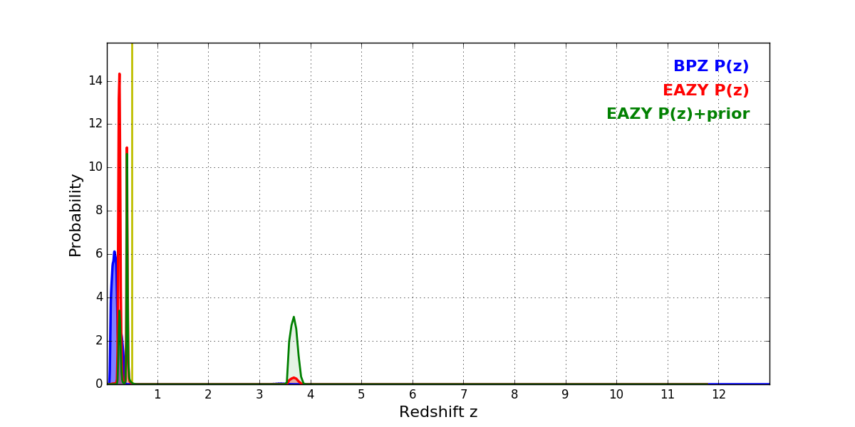 In P(z) plots: Yellow lines mark the cluster redshift z = 0.505,
