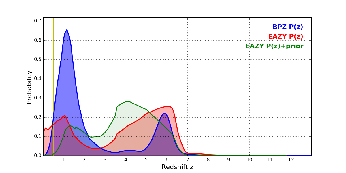 In P(z) plots: Yellow lines mark the cluster redshift z = 0.505,