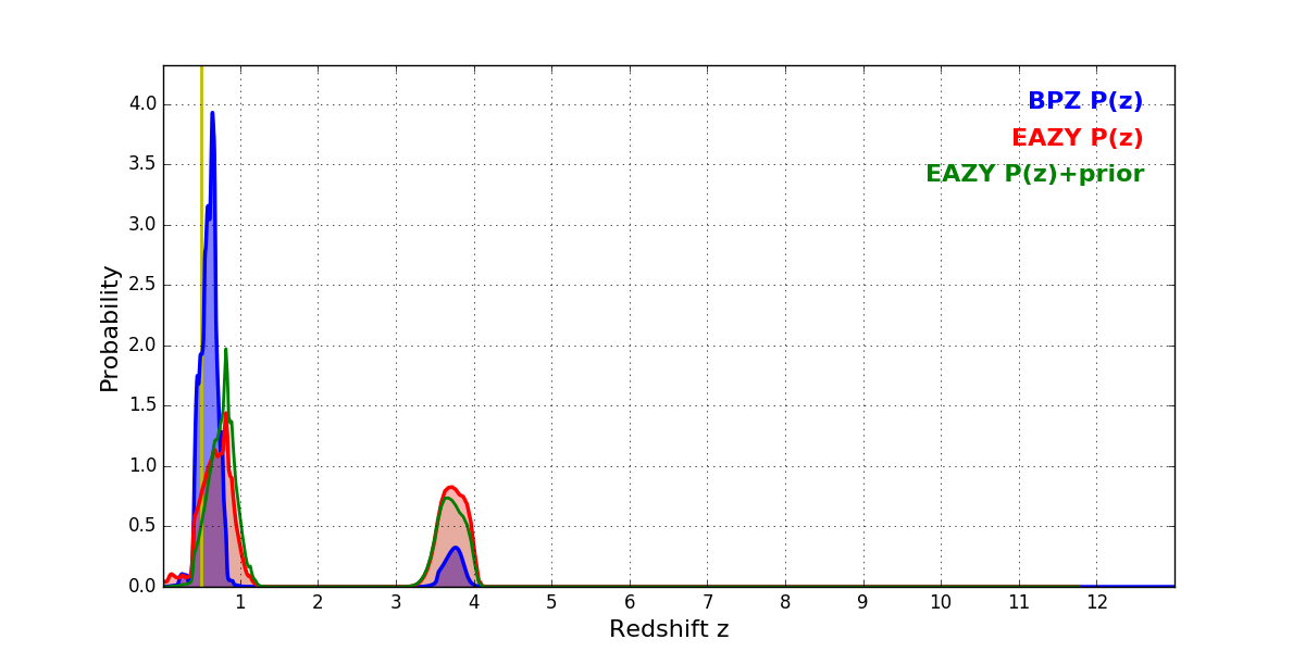 In P(z) plots: Yellow lines mark the cluster redshift z = 0.505,