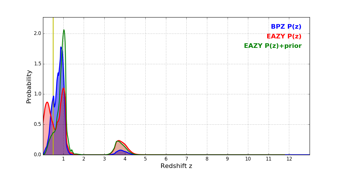 In P(z) plots: Yellow lines mark the cluster redshift z = 0.505,