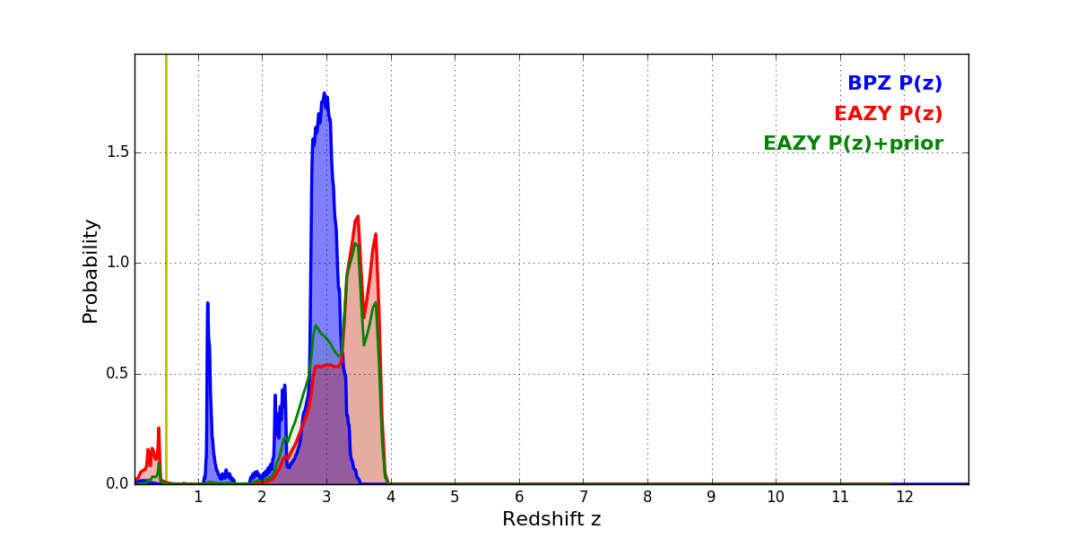In P(z) plots: Yellow lines mark the cluster redshift z = 0.505,