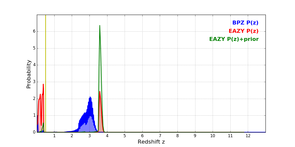 In P(z) plots: Yellow lines mark the cluster redshift z = 0.505,