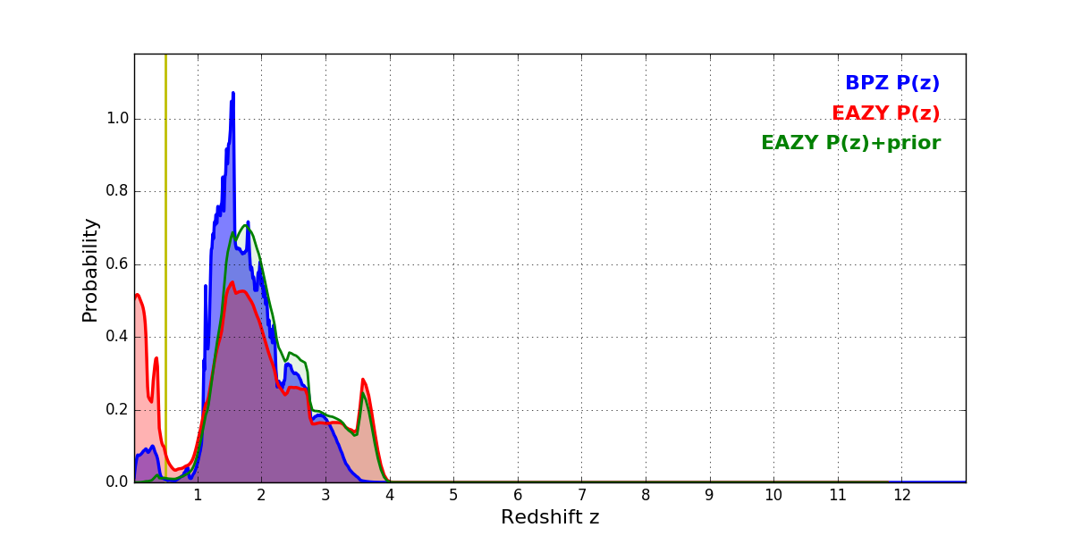 In P(z) plots: Yellow lines mark the cluster redshift z = 0.505,