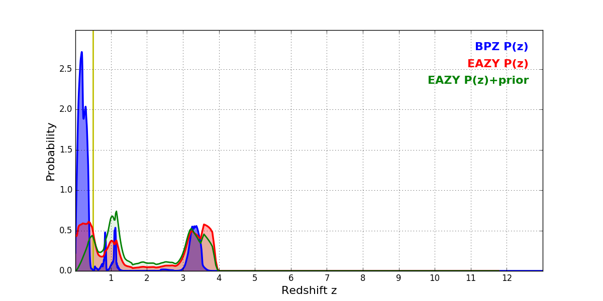 In P(z) plots: Yellow lines mark the cluster redshift z = 0.505,