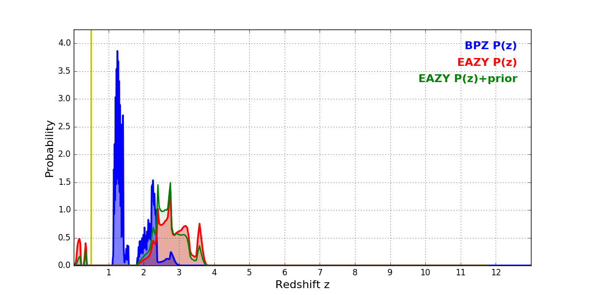 In P(z) plots: Yellow lines mark the cluster redshift z = 0.505,