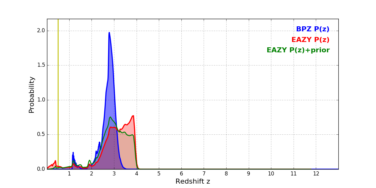 In P(z) plots: Yellow lines mark the cluster redshift z = 0.505,