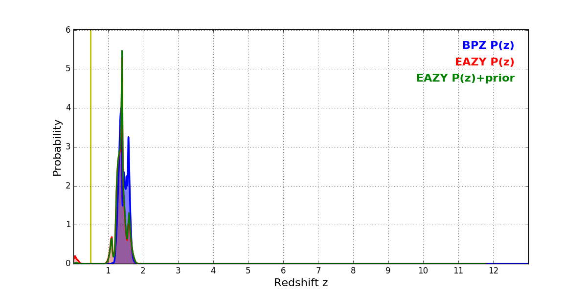 In P(z) plots: Yellow lines mark the cluster redshift z = 0.505,