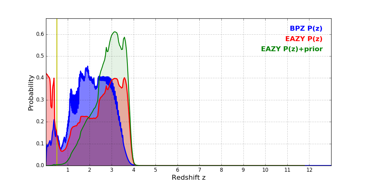 In P(z) plots: Yellow lines mark the cluster redshift z = 0.505,