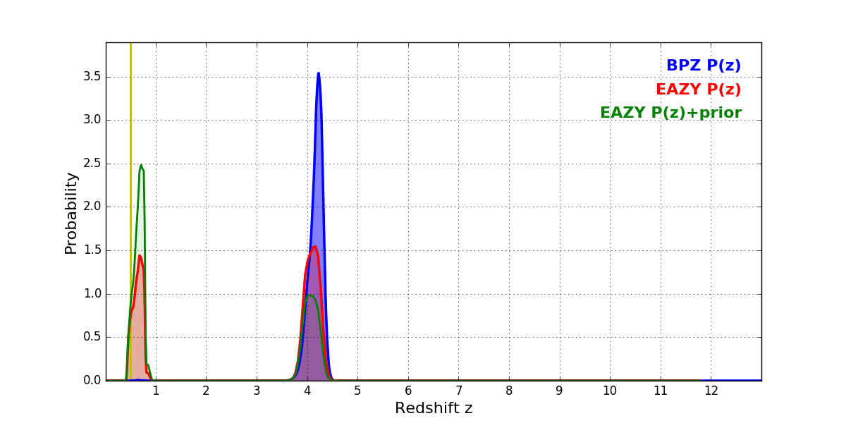 In P(z) plots: Yellow lines mark the cluster redshift z = 0.505,