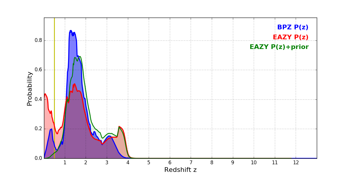 In P(z) plots: Yellow lines mark the cluster redshift z = 0.505,