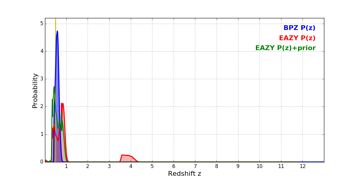 In P(z) plots: Yellow lines mark the cluster redshift z = 0.505,