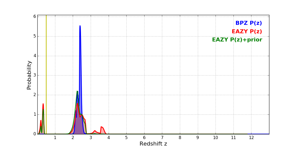 In P(z) plots: Yellow lines mark the cluster redshift z = 0.505,
