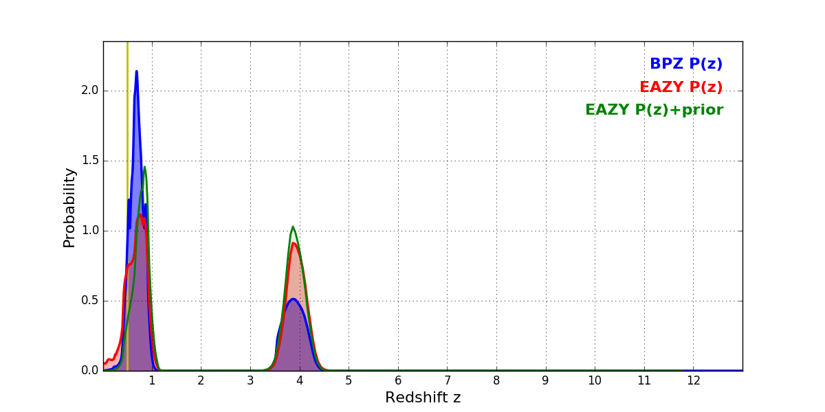 In P(z) plots: Yellow lines mark the cluster redshift z = 0.505,