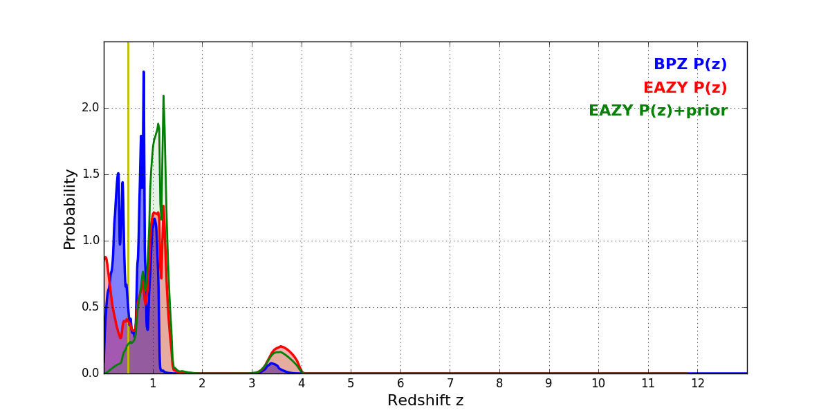 In P(z) plots: Yellow lines mark the cluster redshift z = 0.505,