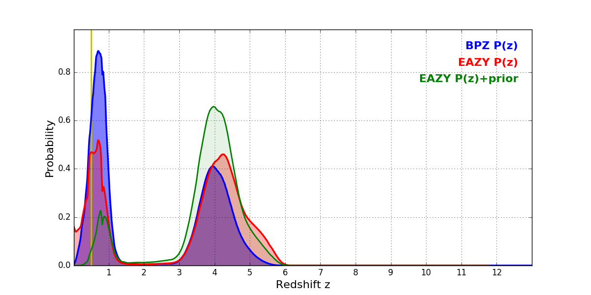 In P(z) plots: Yellow lines mark the cluster redshift z = 0.505,