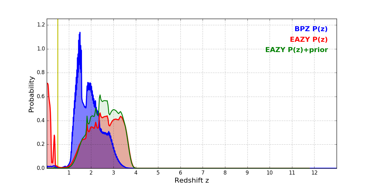 In P(z) plots: Yellow lines mark the cluster redshift z = 0.505,